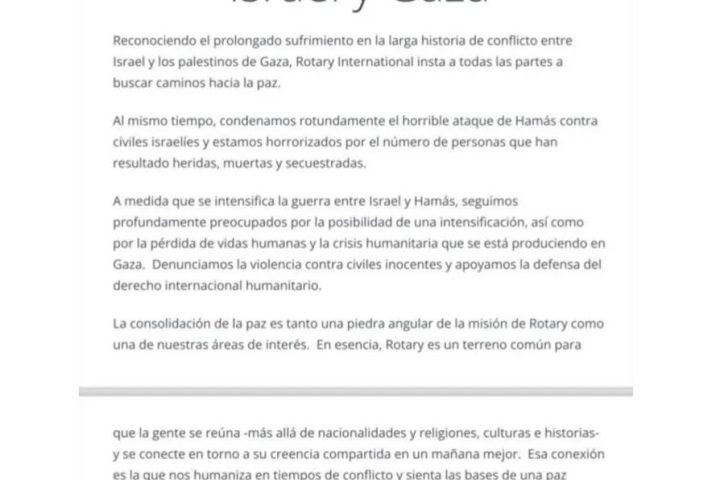 Rotary Club Salar Grande sobre conflicto Israel – Gaza octubre 17, 2023 febrero 26, 2024 admin Reconociendo el prolongado sufrimiento en la larga historia de conflicto entre Israel y los palestinos de Gaza, Rotary Internacional insta a todas las partes a…Sigue leyendo→